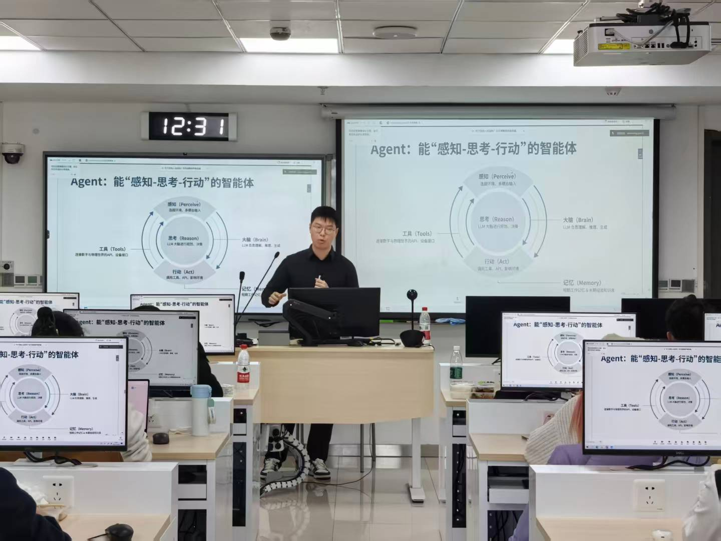 在宣讲中,张洪炜老师深入介绍了Co-Sight的技术实现,指出它是面向复杂问题求解的、基于大模型的“操作系统”或“中间件”,能够帮助参赛选手通过模型组合训练出解决各类问题的AI大模型,从而在实践中持续提升对AI大模型专业知识的理解,增强就业竞争力。此外,张老师还将Co-Sight与主流Agent框架进行比较,分析其优势与改进空间,并结合行业应用可行性为同学们的就业方向提供指引。随后,通过其他工程师现场演示Co-Sight自动完成代码执行、文件读取并生成黄金市场分析报告的全过程,同学们不仅惊叹于其智能水平,更对专业知识与大模型的实际应用有了更深入的认识。