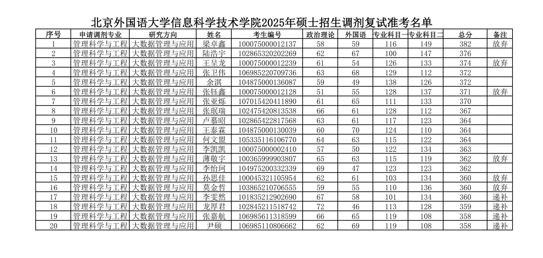 北京外国语大学太阳集团tyc97282025年硕士招生调剂复试准考名单