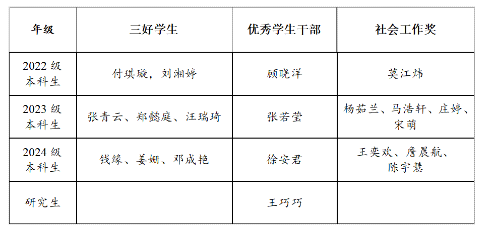 根据《北京外国语大学学生资助工作管理规定》《北京外国语大学学生评优工作条例》,结合学校《关于开展2024-2025学年三好学生、优秀学生干部、社会工作奖评审工作的通知》具体要求,经学生个人申报、班级推荐审核、学院评奖评优工作领导小组审定,学院2024-2025年度三好学生、优秀学生干部、社会工作奖评审结果如下(排名不分先后):